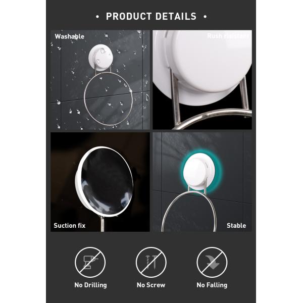 | Feature | No drilling required; Stainless steel body; Rust proof; Remove and Reuse again Strongly suction cup fixed(Silicone glue for rough, uneven wall surface as spare fix option) | |||||||||